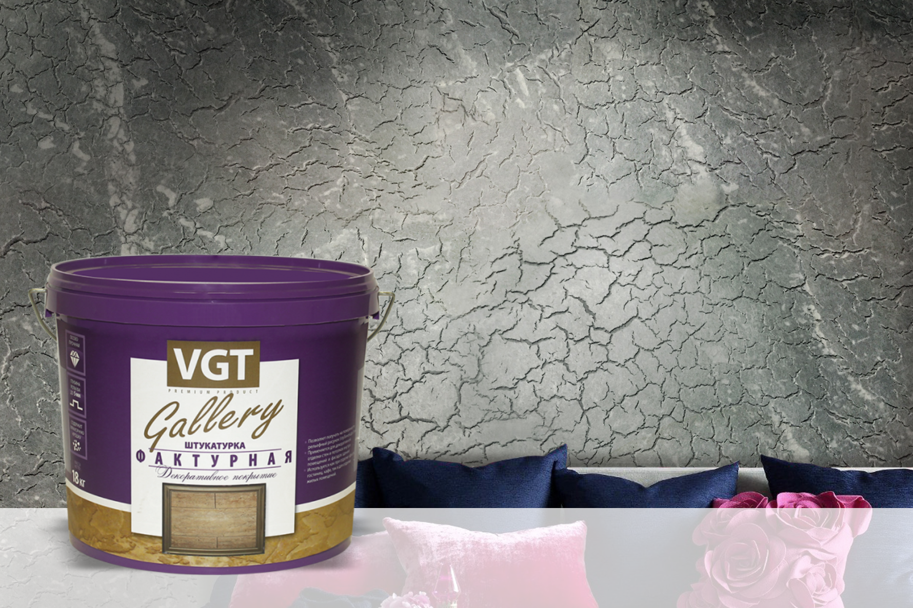 Подготовка поверхности: Поверхность должна быть чистой и сухой. Основание - абсолютно ровным, поэтому поверхность необходимо предварительно зашпатлевать финишной шпатлевкой и загрунтовать грунтовкой глубокого проникновения ТМ «VGT». Для снижения затрат, повышения технологичности нанесения и декоративных свойств покрытия рекомендуется окрасить основание цветной краской в цвет финишного покрытия.