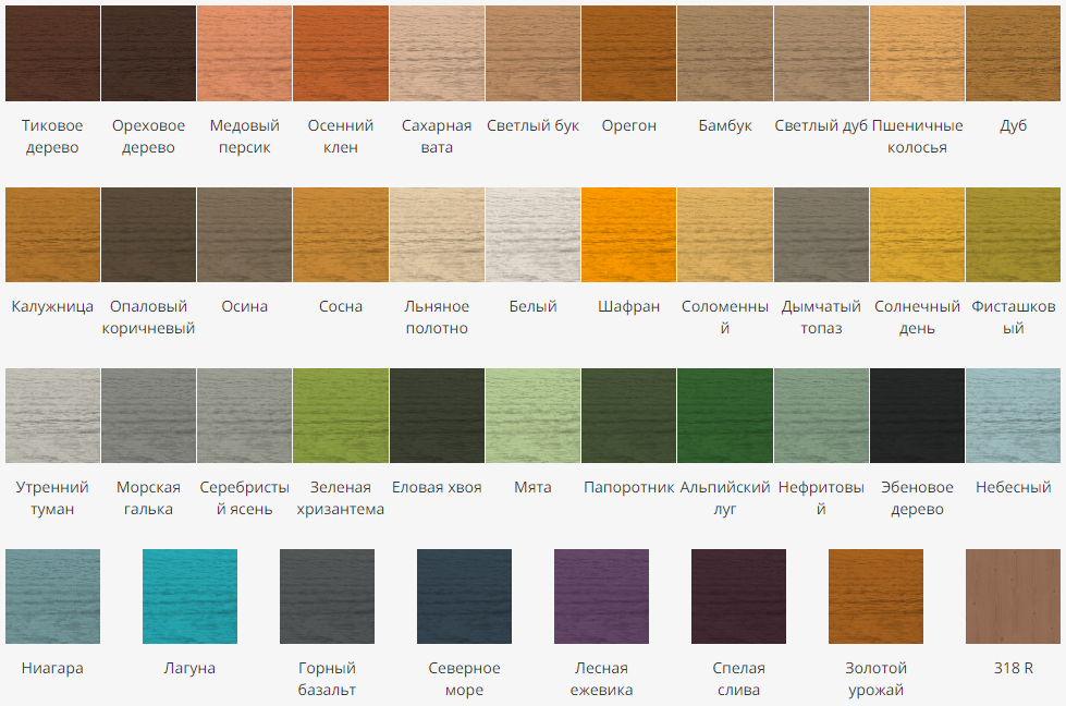 В данном каталоге вы найдете оттенки, которые подойдут для лаков, фасадных пропиток, морилок. Сохраните рисунок древесины, подчеркнув красоту дерева.